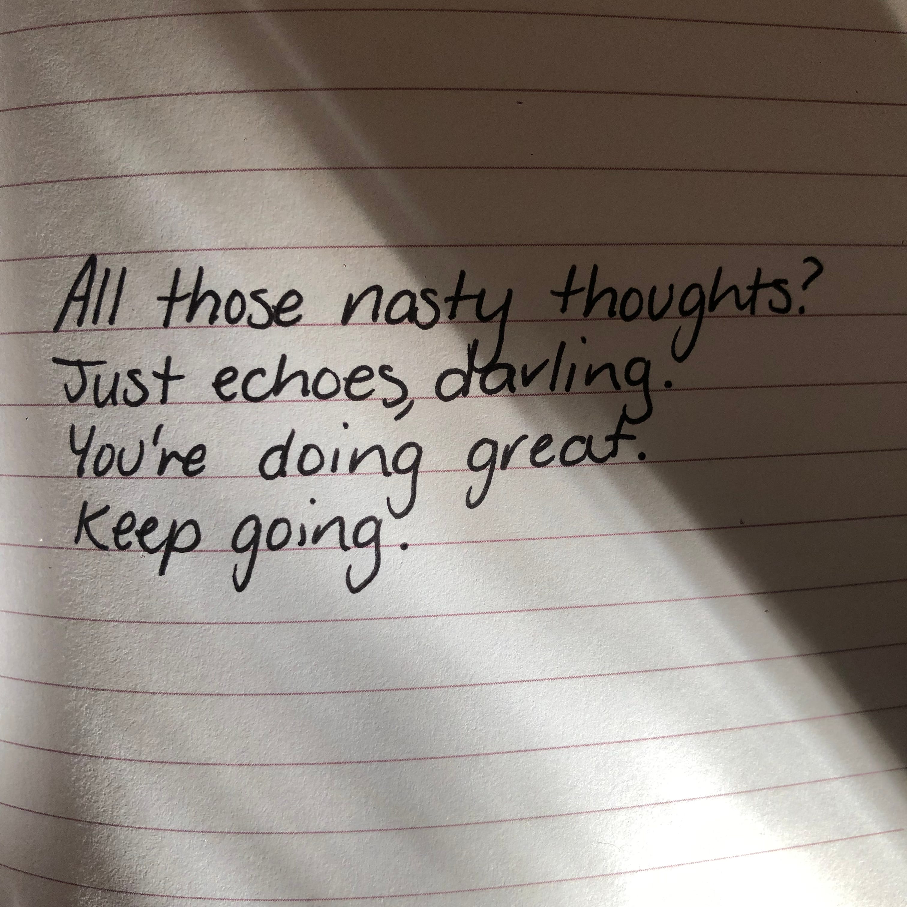 And I don’t know if I’ll learn anything from this… I have a bizarrely strong attachment to negative self talk. But I think I’ve come to realise that what I thought were inescapable, horrible and painful truths about myself… are actually just echoes.