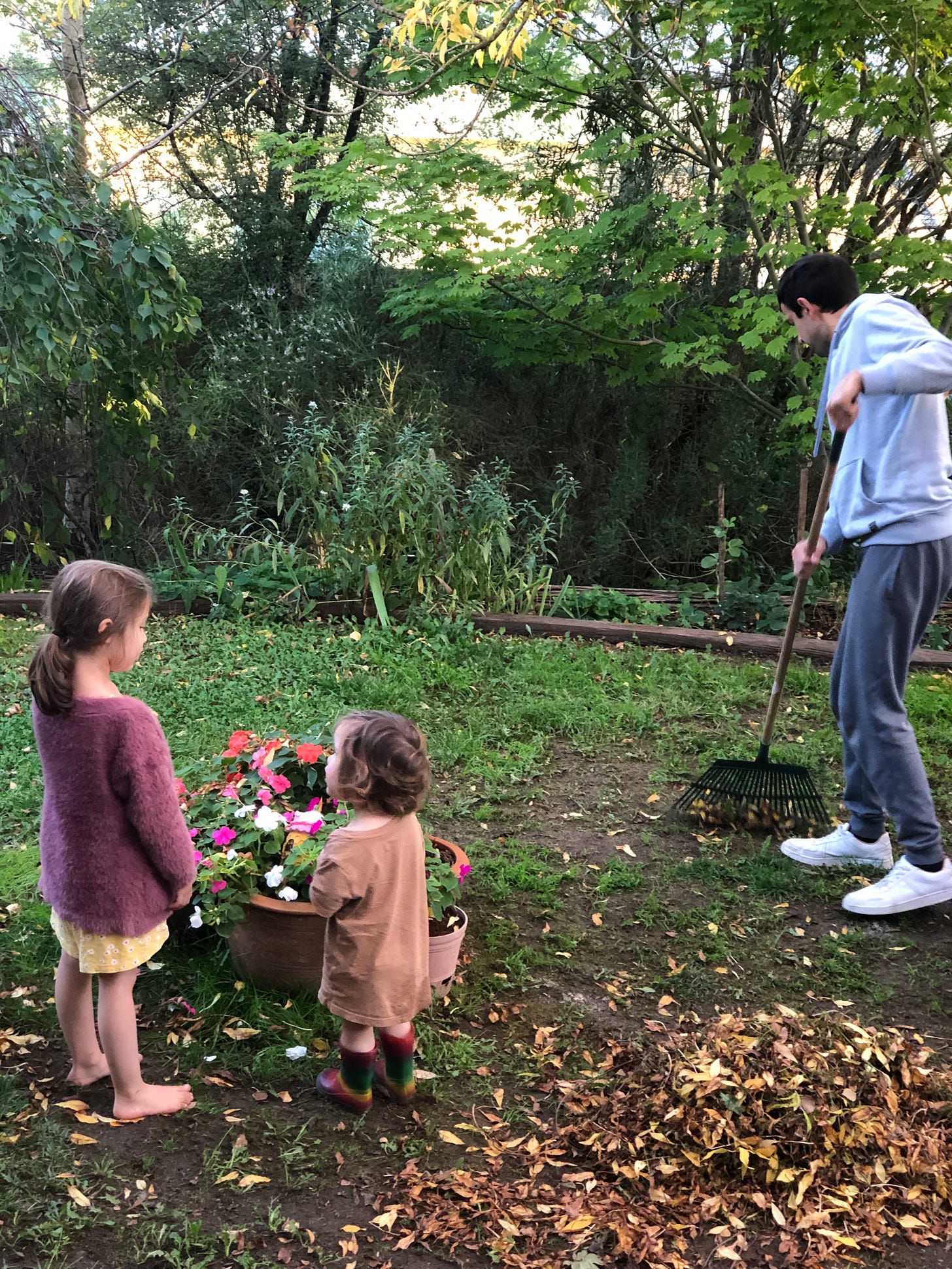 The kids say, ‘Mumma, look we’re having so much fun!’ as they run through the fallen leaves and make cubbies. But they only say it once. I smile and say ‘How wonderful!’ I’m sitting on a special kind of log that huntsmans are allergic to. Nobody repeats things. Everything is said one time and then it is quiet again. But an enjoyable, playful quiet that suits everybody and not just because I got annoyed that it was too noisy.